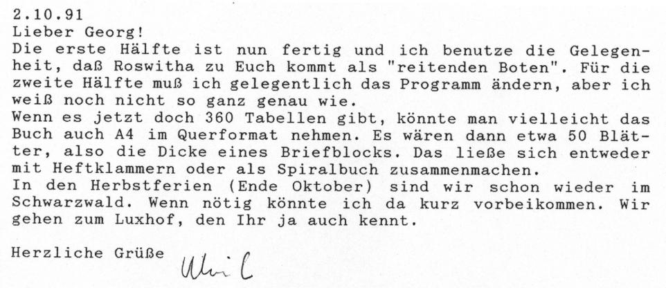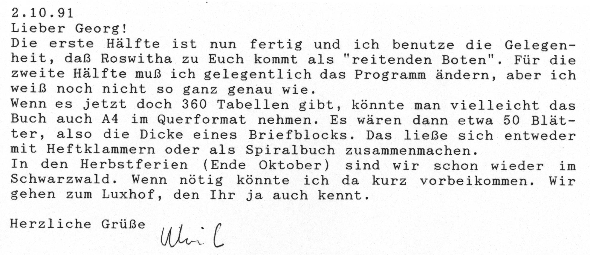 11. 10. 94: Freundliche Bestätigung des Manuskript-Empfangs durch Unger. – 18. 10. 94: Brief von Glöckler – ich soll bis Mitte Mai warten (!); dann will man es gemeinsam besprechen, möchte das Buch nur als Vorschlag sehen! … – Am Abend George Lugosi [Top-Computerfachmann aus Melbourne] da, Gespräch vor allem über mein neues Häusersytem. Er will sich im Februar an die Aufstellung einer Trigonometrie-Formel machen (Nachtrag: ist nicht geschehen). – 21. 10. 94: Brief an Glöckler fertig. – 7. 11. 94: Termin mit [Josef] Morel [vom Verlag am Goetheanum] ausgemacht, Unger habe ihn schon angesprochen. – 31. 3. 95: «Ich-Kosmos»-Einband begonnen. –