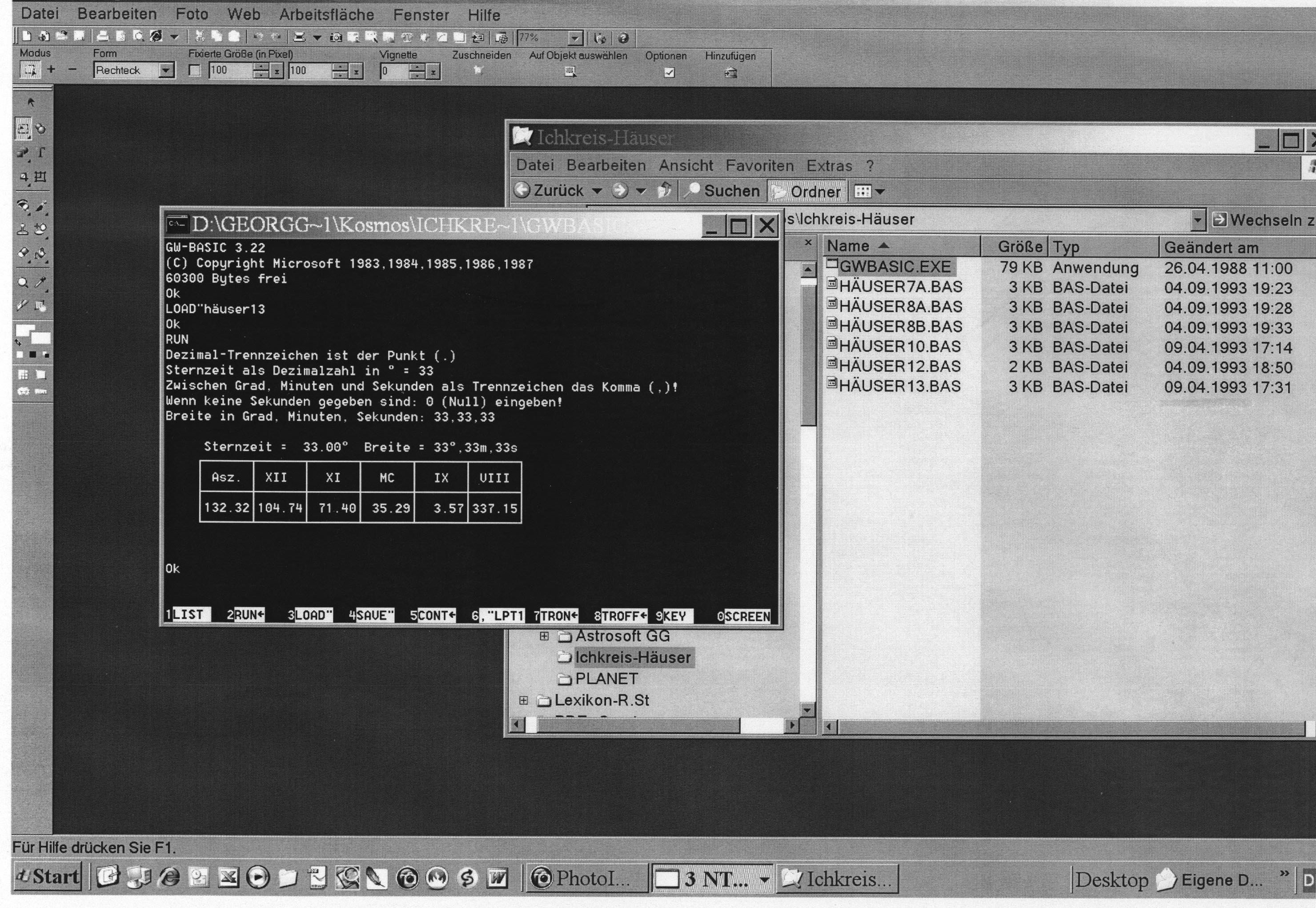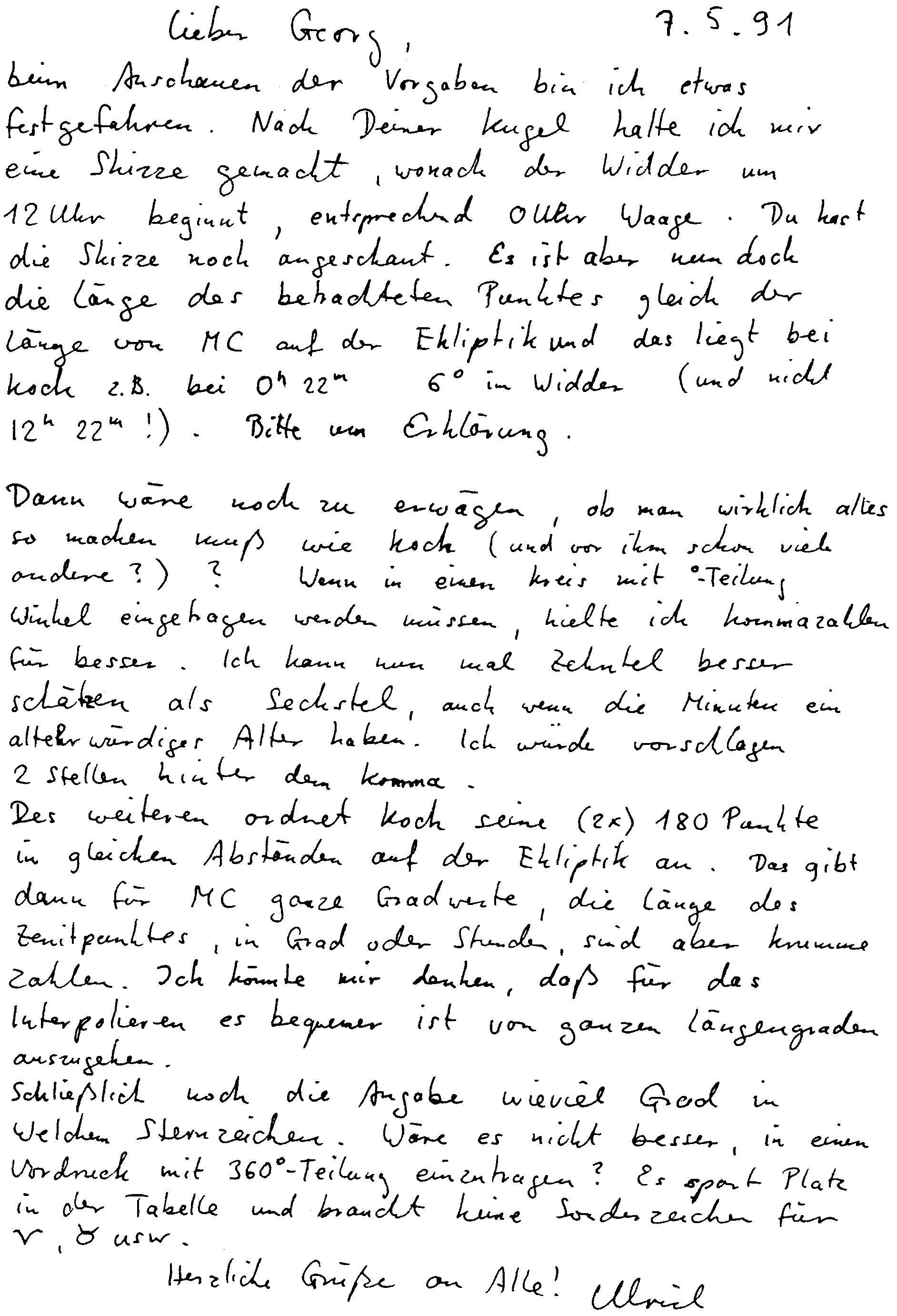 12. 2. 88: Brief von Joachim [Pfeiffer] mit den Darstellungen der verschiedenen Häusersysteme; ich beginne mir Gedanken über eine neue Sicht zu machen. – [(Aus dem Tagebuch von Veronika Goelzer:) 12. 2. 88 – Joachim schickte kopierte Buchseiten, aus denen hervorgeht, dass wir mit unseren autodidaktischen Häuserüberlegungen erst den Schritt von Campanus zu Regiomontanus gemacht hatten... Georg erfand daraufhin ein Häusersystem, das dem von Koch an die Seite gestellt werden könnte.] – 28. 3. 91 (Gründonnerstag): Ulrich [Leyde] bekam den Auftrag, die Berechnungen für die neuen Häuser durchzuführen. – 22. 8. 91: Besuch von Ulrich, er brachte den Ausdruck von einer Seite des Häuserprogramms; ich verglich mit meinem Modell und stellte fest, dass die Sache stimmt! Wir besprachen die Veröffentlichungsform. – 5. 9. 92: Häuserarbeit mit [Xs] Horoskop; Ulrichs Einleitungsentwurf wird von mir vollständig erneuert. – 28. 11. 92: V[eronika Goelzer] brachte einen Brief mit ihren Erläuterungen und Zeichnungen zu dem neuen Häusersystem auf die Post – für Joachim bestimmt, der bald sein Modellbasteln wieder aufgreifen will. (Nachtrag: doch nicht geschehen.) – 5. 9. 93: Als Nächstes möchte ich die Häuserarbeit abschliessen, V’s Anhang gestalten. Gestern hatte ich Ulrichs modifizierte Häuserdateien in den PC gebracht. – 10. 9. 93: Seit einigen Tagen an der Um- und Ausgestaltung von V’s Anhang zu den Häusertabellen gearbeitet, Beginn der Arbeit am PC. (Nachtrag: Die Ausführung wird sich zu einem Buch auswachsen.) 18. 9. 93: Durchbruch auch im Erfassen des neuen Häusersystems nördlich des Polarkreises – Pol als Projektion der Erdmitte, «Schädelstätte». – 29. 9. 93 (Michaeli): Ausdruck vom Häuser-Anhang. – 23. 10. 93: Neuer Titel, nach langer Suche: «Das Häusersystem des Ichkreises». (Später: «Der Ich-Kosmos».) – 30. 10. 93: Ulrich da, um das Programm für das Häusersystem im Bereich nördlich von 64° Breite zu besprechen – wie bekommt man bei den Umstülpungen gleich den richtigen Ausdruck, ohne überkleben zu müssen? Auch über die Anfertigung eines guten Modells und allgemein über PC-Angelegenheiten. – 8. 11. 93: Häuserforschung im Polargebiet geht weiter, neue Dimensionen öffnen sich, erstes Goetheanum [mit der grossen und der kleinen Kuppel] wird sichtbar. Ungenauigkeiten werden ausgebügelt, auch mit V’s Hilfe – noch kaum jemals so intensiv gedanklich gerungen. – 22. 5. 94: Zeichnungen für Häuserbuch – es geht dem Ende zu. – 15. 6. 94: Ich arbeite schon längere Zeit an der besonders schwierigen, aber für das Häuserbuch entscheidenden Abbildung 22 – «Drehung des Ichkreises» in acht verschiedenen Stellungen. – 2. 7. 94: Beginn der Aufzeichnung von [Xs] Horoskop für das Häuserbuch – keiner hat jemals ein solch «schönes» Horoskop bekommen, mit allen drei kosmischen Welten grafisch ausgestaltet. – 4. 7. 94: Es wird einen Zusatz zur Häuserarbeit geben über Tierkreisbilder und Tierkreiszeichen. – 8. 7. 94: Erster Teil vom Häuserbuch durch Diskettenfehler teils entformatiert, ich muss ihn nochmals durcharbeiten, verbessere ihn zugleich; jetzt bin ich am 7. Kapitel. – 9. 7. 94: Erster Teil des «Häuserbuches» jetzt auch fertig, Inhaltsverzeichnis kommt morgen hinzu. – 23. 7. 94: Ich komme auf die Idee, die Häuser-Phänomenologie und andere Hinweise im Buch nach vorn zu nehmen, das Astronomische in die Mitte zu setzen und die Tabellen als Anhang zu bringen – erst dadurch wird ein richtiges Buch daraus, für jeden zu lesen (Nachtrag: Letzteres wird schliesslich ein eigener Band). Ich hatte schon früher befürchtet, die Leute könnten die Häuser-Phänomenologie übersehen, das Buch als nur für Fachleute gedacht beiseite legen. Vereinfachter Titel: «DER ICH-KOSMOS». – 2. 10. 94: Letzter Schliff am Buch: Merkursymbol über Scanner hineingebracht, erste Grafik auf diese Weise einbezogen – möglich, weil klein, braucht nur relativ wenig Speicherplatz. – 4. 10. 94: Erste Brieffassung an [Georg] Unger und [Georg] Glöckler [von der Mathematisch-Astronomischen Sektion am Goetheanum, Dornach]. –